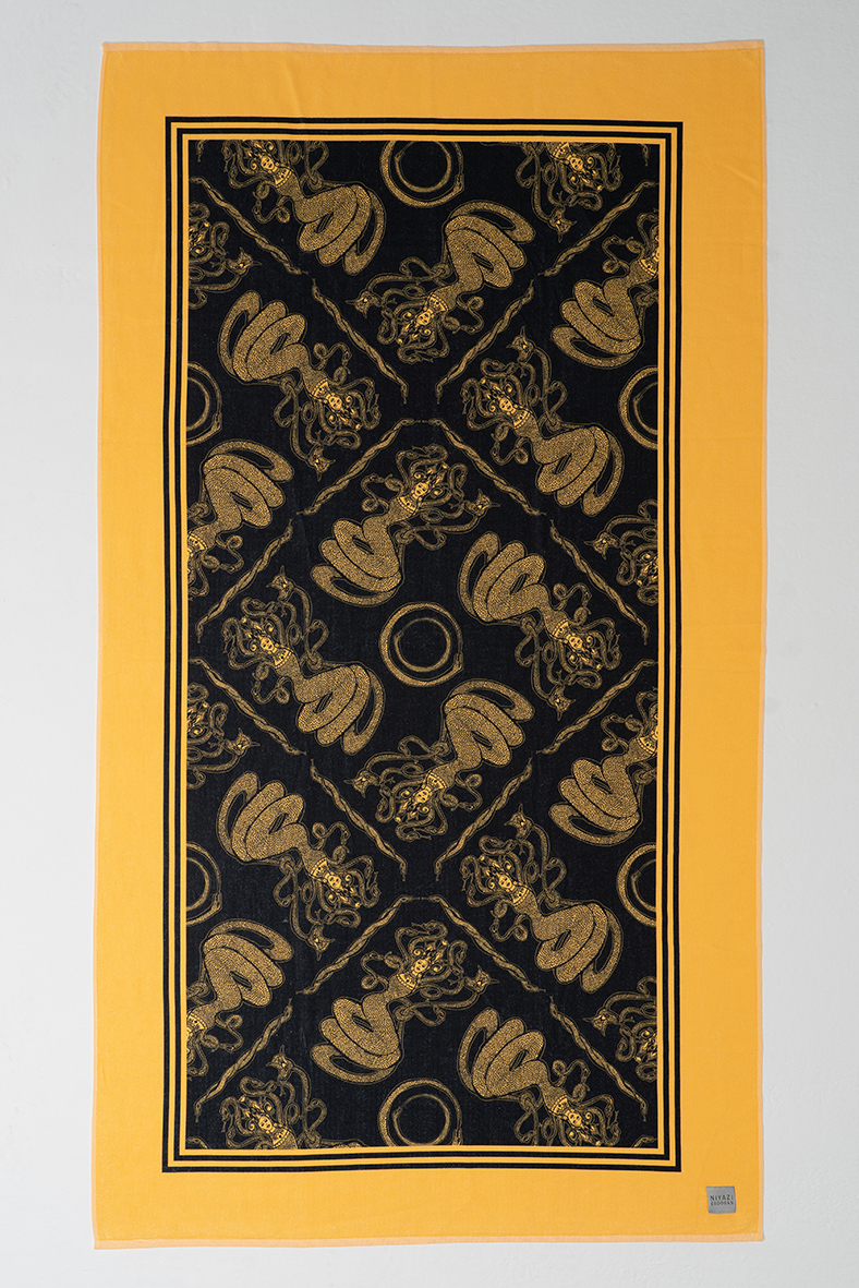 Niyazi Erdoğan, koleksiyondaki ikinci desen için de global modaevlerinin vazgeçilmez sembollerinden biri olan Medusa’dan yola çıkıyor ve yine kendi kültürel zenginliğimizin önemli unsurlarından biri olan Şahmeran’ı sarı-siyah tonlarda koleksiyona taşıyor. Doğup büyüdüğü Tarsus’la ilişkilendirilen bu figür için tasarımcı, “Çocukken beni çok ürküten bu desenin zamanla ne kadar derin anlamlar taşıdığını hem Anadolu hem Asya mitolojisinde ne kadar önemli bir yeri olduğunu keşfettim. Bu güçlü ve tılsımlı kadın figürünü koleksiyona taşıyarak yine kendi topraklarımızdaki çeşitliliğe vurgu yapmak istedim,” diyor.