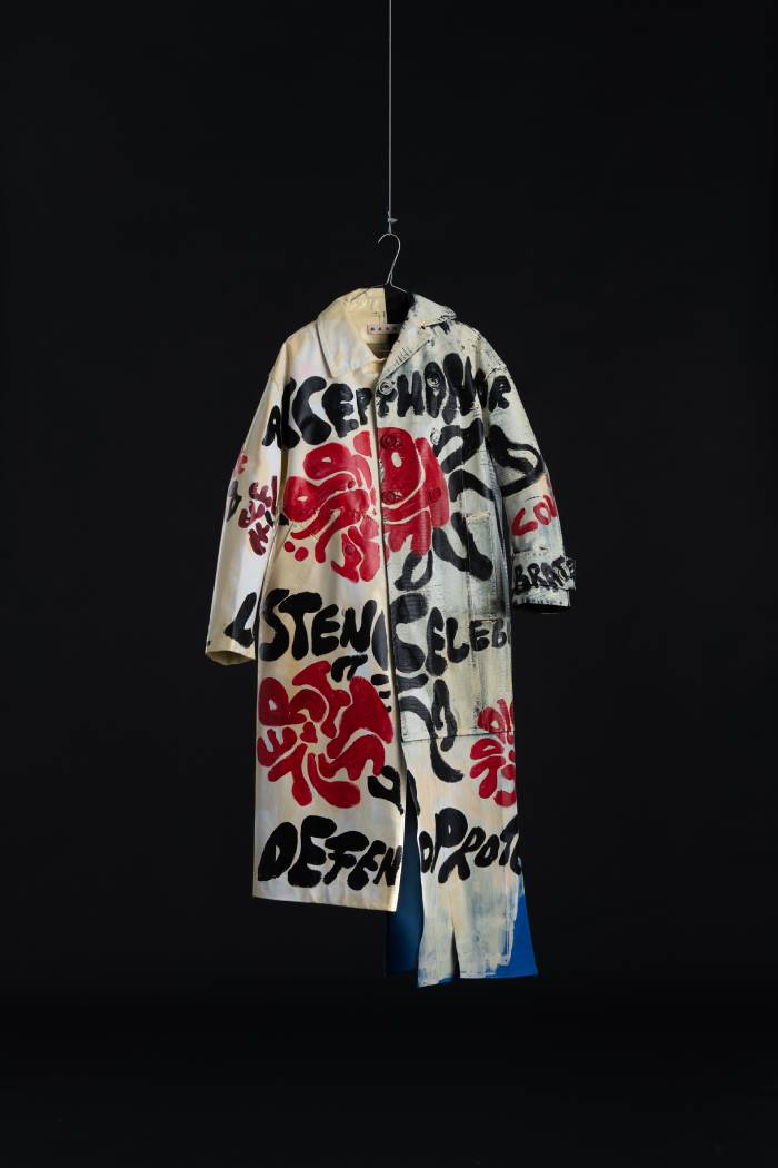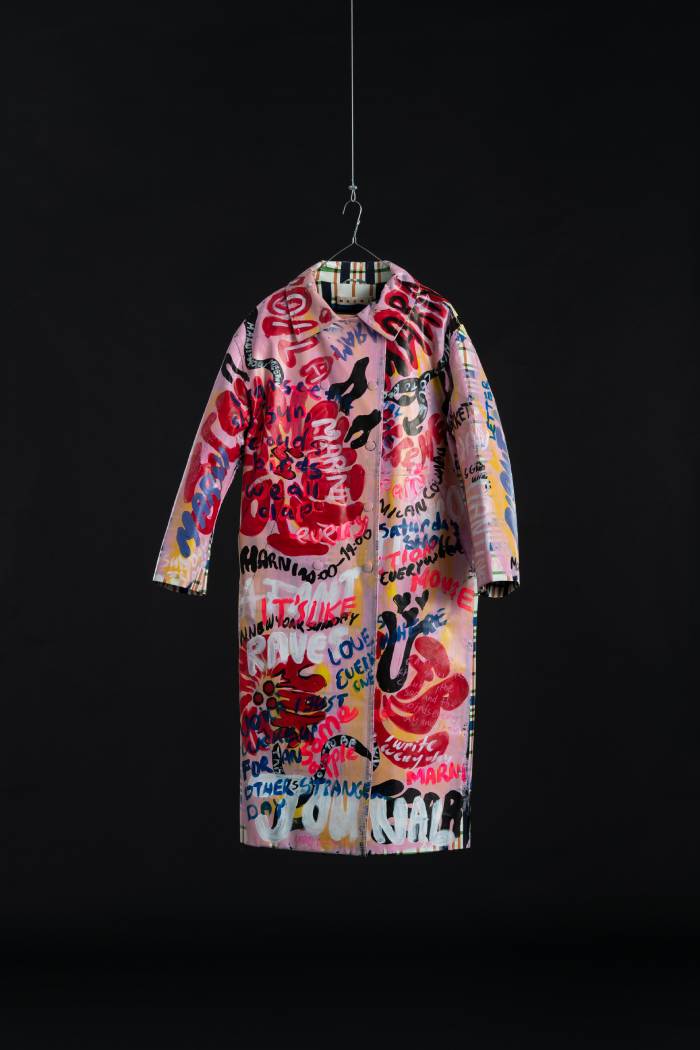Tasarım stüdyosuna geri dönüldüğünde, Marni’nin değerli arşivleri nötr bir tuval görevi gördü; önceki koleksiyonlar dönüştürülerek eşsiz sanatsal parçalara dönüştü, karantina sırasında toplanan şiirler, kelimeler ve motifler elle boyandı.