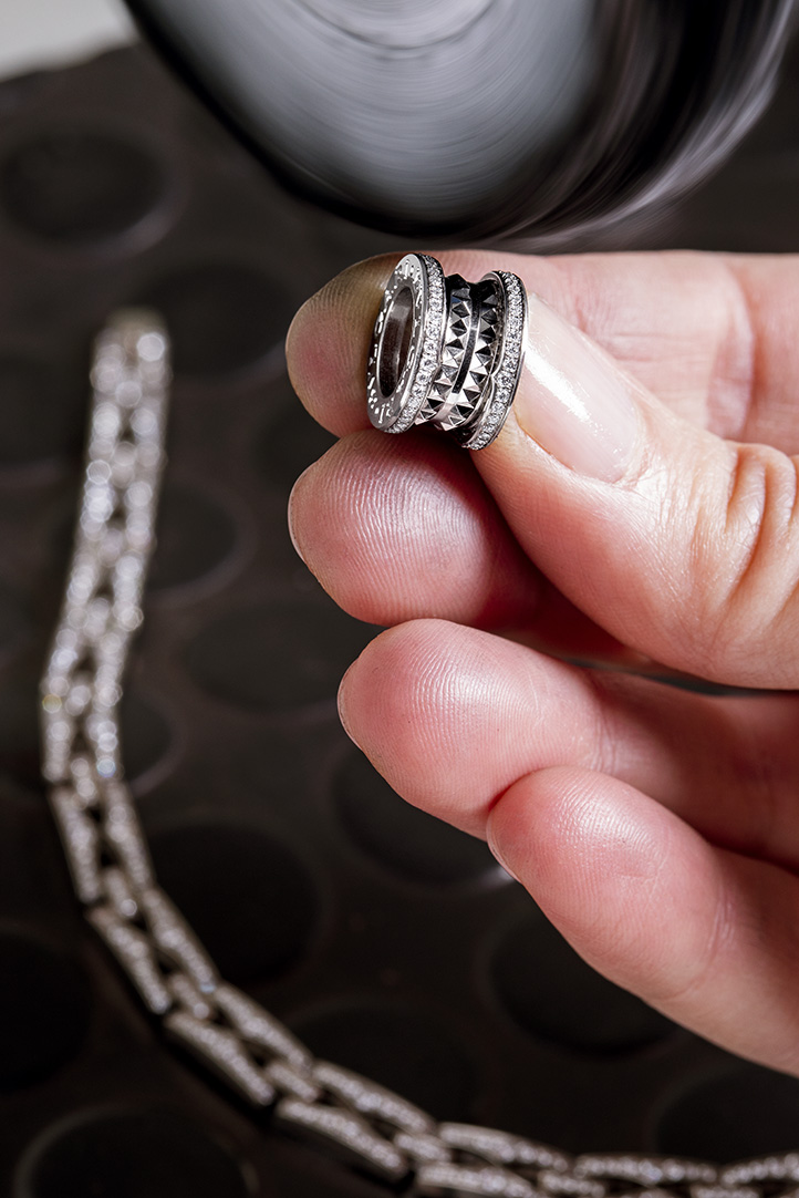 Yenilikçi mücevher tasarımına ve dahiyane işçiliğe bir övgü olan altın kolye, her biri elle bir araya getirilerek ortaya çıkarılan 3 parçadan oluşan, endüstriyel tasarım ile efsanevi Bvlgari’nin mücevher işçiliğinin teknik bilgisi arasındaki benzersiz birlikteliği temsil eden ayrı modüllerden oluşuyor. B.zero1 kolye ya da kolye ucu olarak veya kolye çıkarılarak kullanılabiliyor. Ayrıca yuvarlak kolye ucunun içinden geçebilecek ek ince bir 18 kt beyaz altın zincir ile birlikte satışa sunulan kolye, toplamda üç farklı stil seçeneği sunuyor. Yeniden hayat verilmiş zincirin cesur karizması, kenarlarında son teknoloji siyah seramik vurgulara sahip pırlantalarla süslenmiş 18 kt sarı altın bir kolye ucu ve 18 kt pembe altın zincir ile bir araya geliyor.