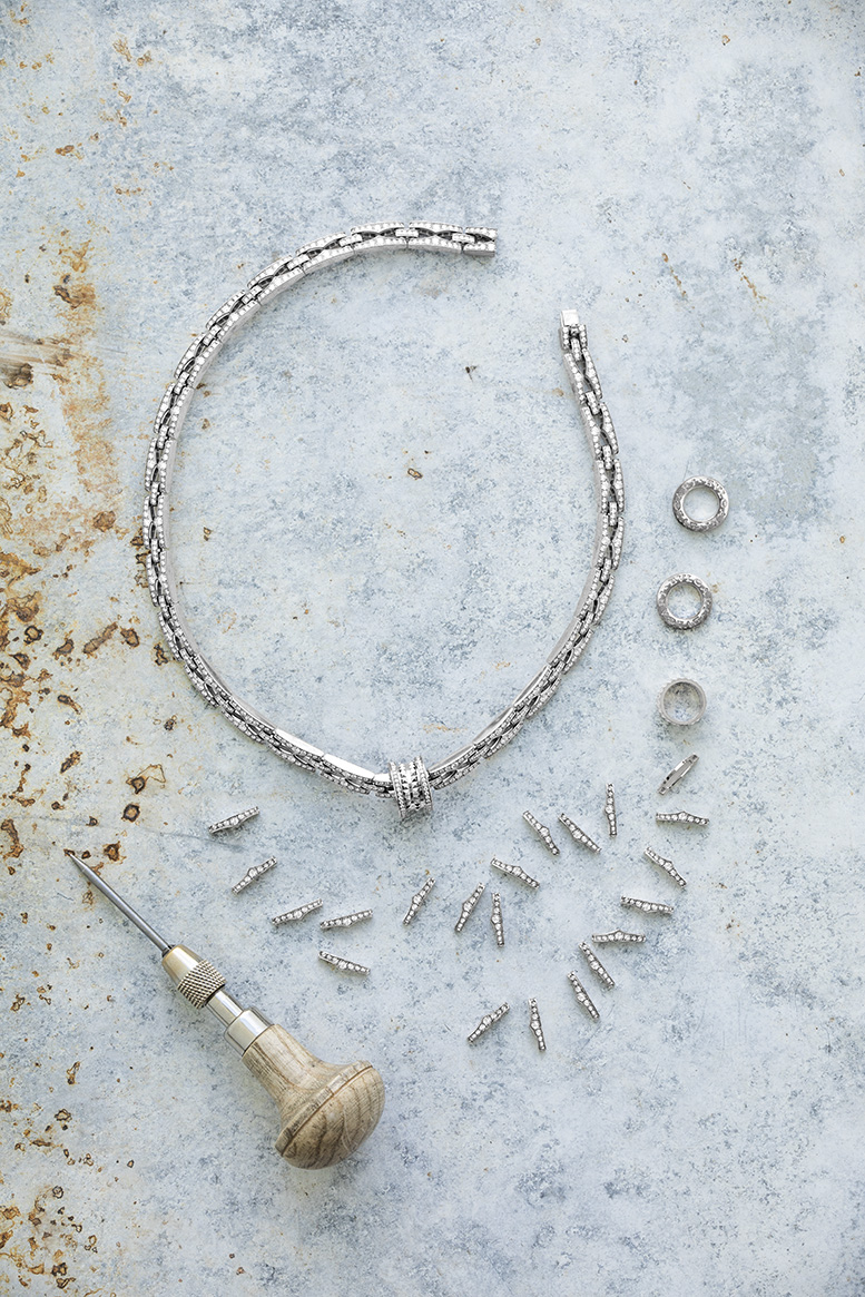 Koleksiyonun en son yeniliklerinin tartışmasız en öne çıkan parçası, 7.20 karat ile bugüne kadarki en değerli mücevher statüsünü fetheden B.zero1 Rock’ın ışıltılı bir yorumu olan göz alıcı 18 kt beyaz altın kolye. Çarpıcı tasarımın, seçkin mücevher sanatının ve çekici çok yönlülüğün benzersiz bir birleşimi olan kolye, her bir halkası, ikonik yüzüğün kendine özgün kenarlarını ve yuvarlak, cüretkâr şekillerini yansıtan orijinal bir zincir motifi ile birleşiyor. Vizyoner mimar Le Corbusier’den ve insan vücudu metriklerine dayalı ölçüm çalışmalarından esinlenen bir tasarım yaklaşımı olarak orantılar bile yüzüğe sadık kalıyor, adeta her öğe bir B.zero1 ölçü birimi haline geliyor.