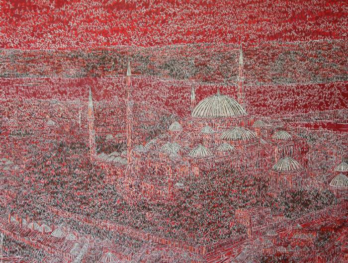 Kuş bakışı İstanbul resimlerinde, izleyenler eserlerin bir parçası olarak tek başına şehri deneyimler, rüzgarı dinler. Artık ezanlar, kuşların ötüşü, vapur sesleri bu kalabalık şehirde sanki bir kişi için vardır; İstanbul’u dinleyenler ve izleyenler için…