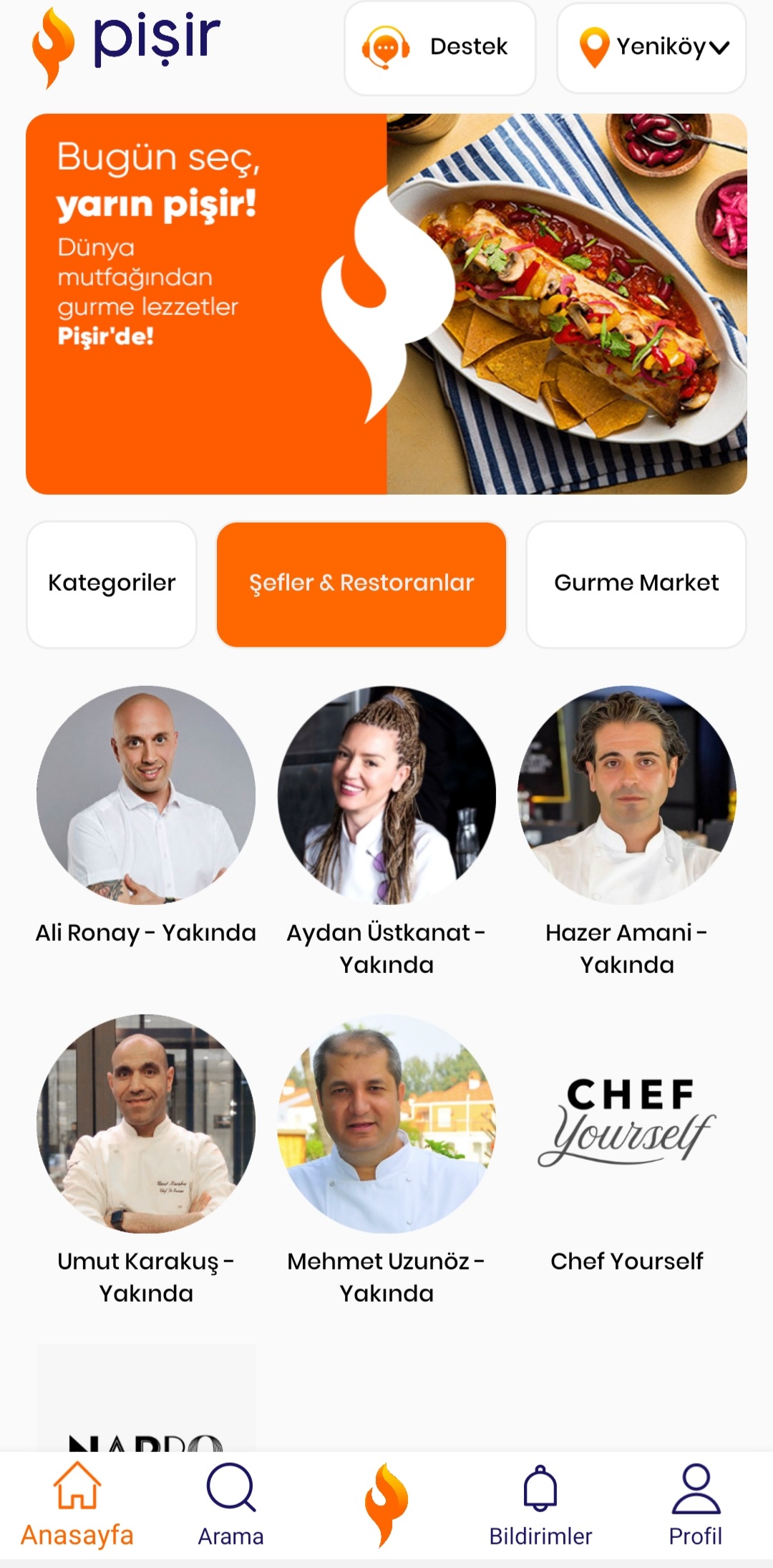 Ali Ronay, Aydan Üstkanat, Hazer Amani, Umur Karakuş ve Mehmet Uzunöz ile anlaştık. Çok yakında onların özel yemekleri platformumuzda yer alacak. Ayrıca Chef Yourself ve Nappo’nun lezzetleri de yakında Pişir uygulamasında yerini alacak. İlerleyen süreçlerde de yeni şefler ve restoranlar da eklemeye devam edeceğiz.
