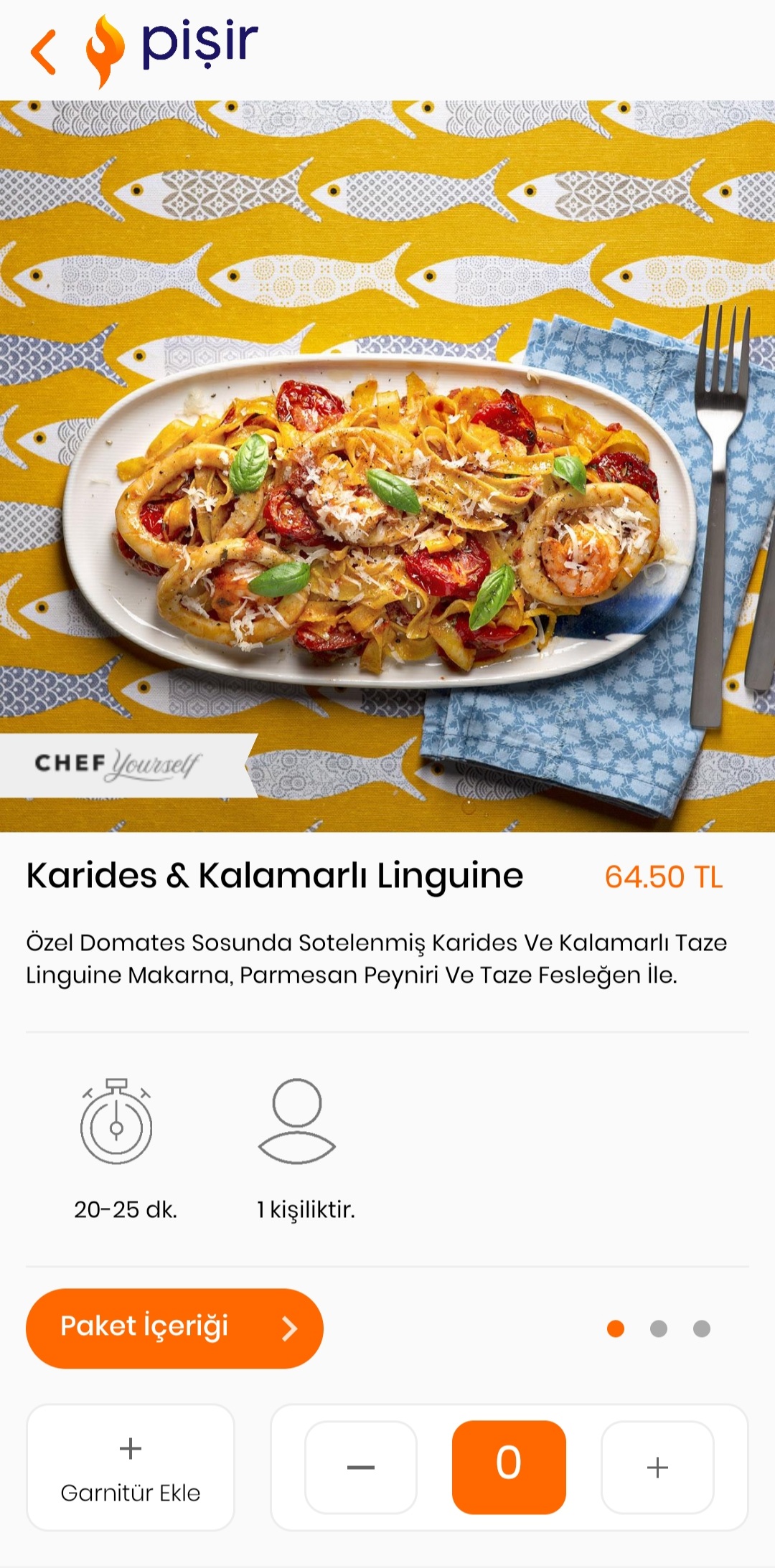 Kullanıcılar öncelikle Google Play ya da App Store’dan ‘Pişir’ uygulamasını cep telefonlarına indiriyorlar. Kayıt işlemlerini tamamladıktan sonra ana sayfadaki kategoriler veya şef-restoranlar arasından Türk ve dünya mutfaklarından damak zevkine uygun yemeği seçebiliyorlar. Yemek seçiminin ardından teslimat bilgisini seçiyorlar ve siparişlerini tamamlıyorlar. Kullanıcıların seçtiği ürünler tercih ettikleri porsiyonda, özenle seçilmiş, temizlenmiş, tartılmış ve pişmeye hazır şekilde kapısına kadar teslim ediliyor. Kullanıcılarımız ise malzemeleri bir araya getirip pişiriyor ardından da afiyetle yiyebiliyorlar.