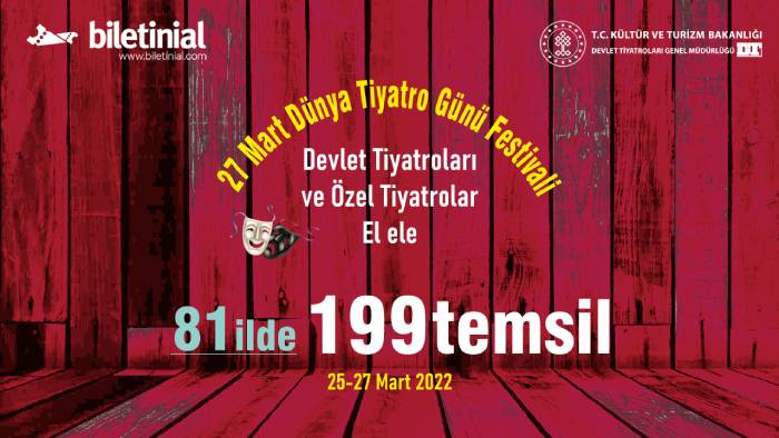 Dünya Tiyatro Günü tam 61 yıldır aralıksız olarak kutlanıyor. Dünya çapında kutlanan bu özel günde, birçok sanat grubu ve tiyatro, kapılarını izleyicilerine büyük bir coşkuyla açıyor. Bu yıl Dünya Tiyatrolar Günü ülkemizde çok daha etkin bir şekilde kutlanacak. T.C. Kültür ve Turizm Bakanlığı’nın girişimiyle, Kültür ve Turizm Bakanlığı’na bağlı Devlet Tiyatroları ve özel tiyatroların işbirliği ile 27 Mart Dünya Tiyatrolar Günü kapsamında 3 günlük Tiyatro Festivali gerçekleştirilecek. Festival kapsamında tiyatro severler 25-27 Mart tarihlerini kapsayan 3 günde ve 81 ilde 17’si çocuk temalı olmak üzere 199 oyunu sembolik ücretlerle izleyebilecek.