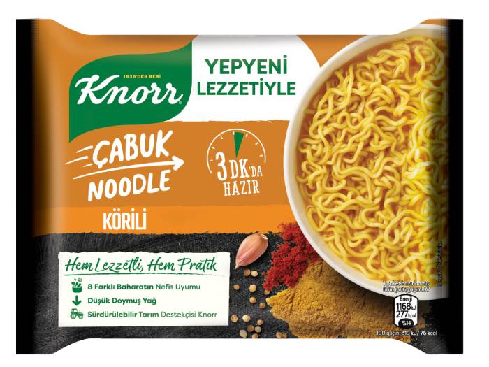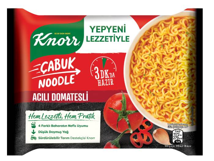 1838’den bu yana tüm dünyada şeflerin uzmanlığını ve lezzetli yemeklerin hayata kattığı keyfi yapımı kolay tariflerle insanlarla paylaşan Knorr, Çabuk Noodle lezzetlerini yeniliyor. Daha uzun ve lezzetli hamuruyla özenle hazırlanan Knorr baharatları bir araya getirilerek yenilenen Acılı Domatesli, Tavuk Çeşnili ve Körili Çabuk Noodle’ları ile Knorr hem lezzeti hem de eğlenceyi katlıyor. Hazırlaması üç dakika kadar kısa, damaklarda kalan tadı ise uzun süren bu yenilenen lezzetler, dünya mutfağının eşsiz tadını hızlı ve lezzetli yapımıyla her an her yerde noodleseverlerle buluşturmaya hazırlanıyor.