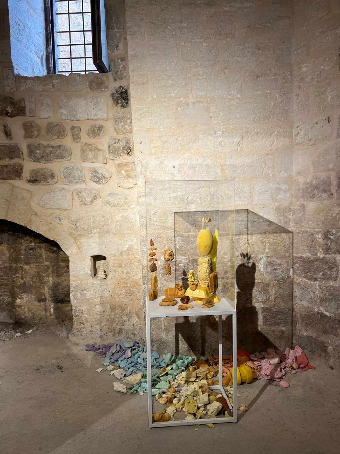 Sanatçı eserinde Marmara ve Karadeniz kıyılarındaki kumsallardan ve mağaralardan kurtarılan strafor parçalarını kullanıyor. Straforların üretildikleri ve atıldıkları an arasındaki yolculuğu boyut, renk ve yoğunluklarında gizlenmiş ipuçlarıyla bağdaştıran Horada aslında eskimiş canlılıkları selamlayarak hem Amerikalı filozof Donna Haraway’in “belayla yaşamak adlı fenomenini uyguluyor hem de bir atık ekonomisi oluşturuyor. Renk ve şekillerinden üretim kökenleri anlaşılan her bir parça yüzeylerindeki izlerden de geçirdiği serüvenleri ele veriyor. Eser, ekstra sanatsal olarak tabir edilen dış etkenlerin straforun geçirdiği süreçlere olan yansımasını postmodernist bir edayla ziyaretçilere aktarıyor.