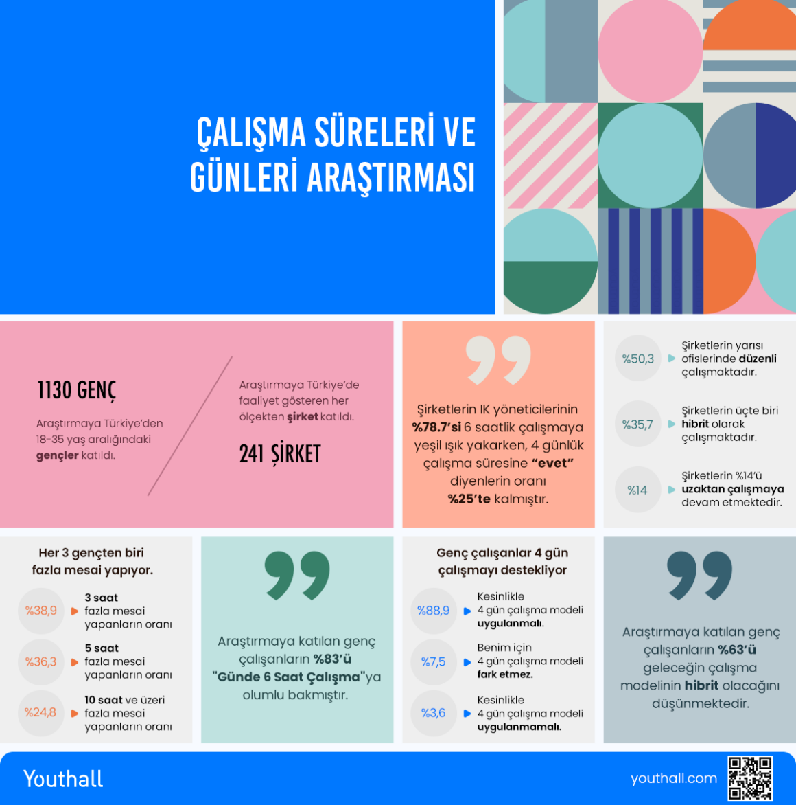 Y ve Z kuşağı, tüm dünyada çalışma hayatının kurallarını sarsmaya devam ediyor. Bakan Vedat Bilgin’in 18 Temmuz tarihli konuşmasında dile getirdiği “çalışma saatleri azaltılmalıdır” görüşünün ardından, konunun iş dünyasındaki yansımalarını ölçmek için “Çalışma Süreleri ve Modeli” araştırmasını hayata geçiren “Gençlerin kariyer platformu’’ Youthall, araştırmanın sonuçlarını açıkladı. Online olarak yapılan araştırmaya 241 şirket ve 1130 genç katıldı. Araştırma, Türkiye’de gençlerin haftada 4 gün çalışmak istediğini gözler önüne serdi. Gençlerin büyük bir kısmı günde 6 saat çalışmaya olumlu bakarken, şirketlerin çoğunluğu çalışma saatlerinin azaltılmasına yeşil ışık yaktı.