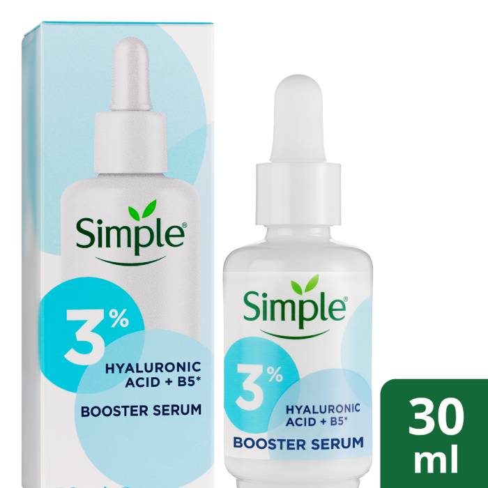 Simple %3 Hyalüronik Asit ve B5 Nemlendirici Booster Serum: Hyalüronik Asit, cilt nemini arttırıyor, nemsizlikten oluşan kırışıklıkların giderilmesine yardımcı oluyor ve sebum üretimini dengeliyor. Provitamin B5, cildi yumuşatıyor, cilt hassaslılığının giderilmesine yardımcı oluyor. Pentavitin ise 72 saat nemlendirme sağlıyor ve bu nem yüzün yıkanmasıyla geçmiyor. Önerilen satış fiyatı: 249 TL + KDV