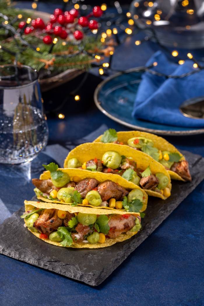 Takoların iç kısımlarına sırası ile avokado püresi, mısır, brunoise şeklinde doğranmış soğan ve jalapeno biber koyulur. Pişen hindiler şişten çıkarılarak takolara ilave edilip servise hazır hale getirilir.