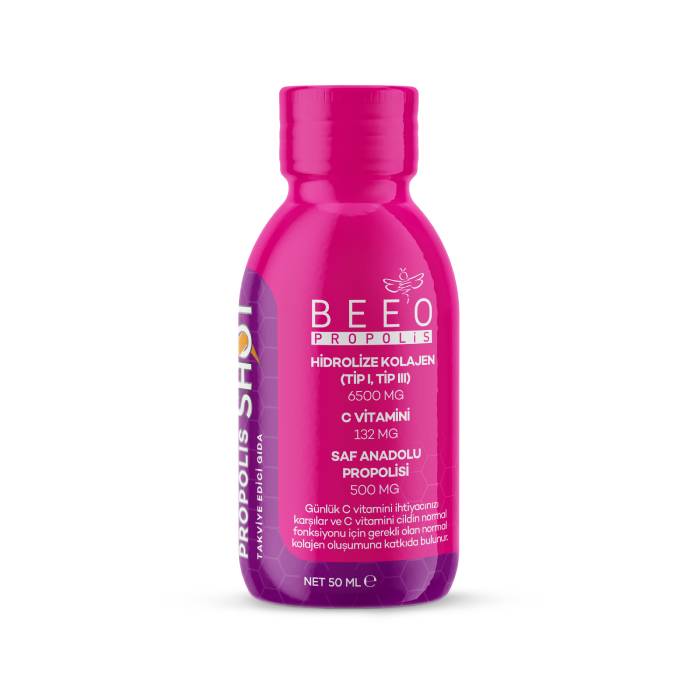 Arıların bitkilerin yaprak, sap ve tomurcuklarından toplayarak kovandaki sterilizasyonu sağlamak için ürettiği değerli Anadolu propolisini, çilek suyu, nar suyu, ham bal, tarçın ve Tip1-Tip3 kolajen ile buluşturan BEE’O Propolisli Kolajen Shot; lezzetli içimiyle cildin nem içeriğini destekleyerek ince kırışıklıkların görünümünü azaltıyor ve güzelliği doğal yollardan destekliyor. Üstelik 1 adet kolajen shot günlük C vitamini ihtiyacının tamamını karşılarken, cildin normal fonksiyonu için gerekli olan kolajen sentezine katkıda bulunuyor.