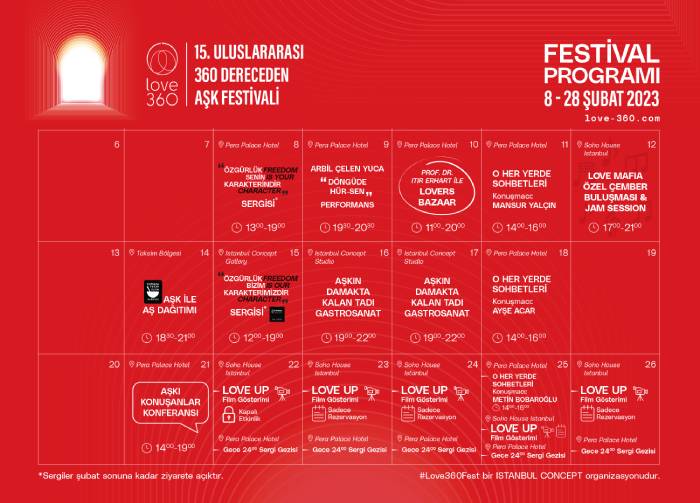 Fikir annesi Işık Gençoğlu küratörlüğünde hayata geçen, İstanbul’un Kültür, Sanat, Tasarım ve Yaşam Festivali 360 Dereceden Aşk || @Love360Fest, onlarca kültür-sanat-tasarım profesyonelinin, yüze yakın eserin, pek çok kurum ve STK’nın katılımıyla bu sene Türkiye Cumhuriyeti’nin 100.yılı olması vesilesiyle çok daha farklı bir heyecan ve gururla, yine halka açık sergiler, performanslar, müzik dinletileri, söyleşiler ve çeşitli etkinliklerin yanı sıra “Aşkı Konuşanlar Konferansı”, “LOVE UP Sinema Kuşağı”, “Lovers Bazaar”, “Aşkın Damakta Kalan Tadı” ve “O Her Yerde Sohbetleri” gibi markalaşmış projeleriyle dolu dolu geçecek ve şubat sonuna dek sürecek.