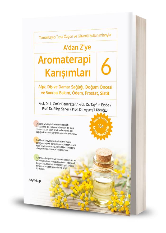 Aynı zamanda Türkiye’de çok satan, Tamamlayıcı Tıp Onayı ve Güvenli Kullanım Önerileriyle bir ilk olan ‘A’dan Z’ye Tıbbi Bitkiler’ ve ‘A’dan Z’ye Tıbbi Yağlar ve Aromatik Sular’ kitaplarının yazarlarından da olan dört profesör, 6 ciltten oluşan ‘A’dan Z’ye Aromaterapi Karışımları’ serisinin bu 6’ncı ve son kitabında; tıbbi etkinlikleri bilimsel olarak kanıtlanmış uçucu yağlardan ve diğer doğal ürünlerden hareketle hazırlanan Ağız, Diş ve Damar Sağlığı, Doğum Öncesi ve Sonrası Bakım, Ödem, Prostat ve Sistit rahatsızlıklarına yönelik olarak hazırlanmış 164 aromaterapi karışımı (aromaterapötik) yer almaktadır. Bu şekilde 6 ayrı ciltten oluşan tüm serimiz ile toplam 1843 özgün aromaterapi karışımı okuyucularımıza sunulmuştur.