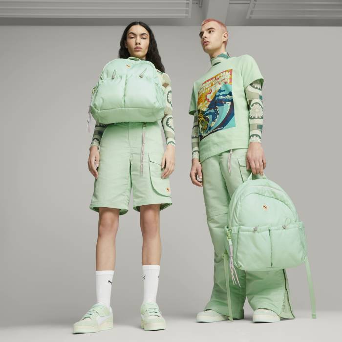 60’lar ve 70’lerin sörf kültürüne atıfta bulunan PUMA x PALOMO Koleksiyonu; o döneme özgü macera ve özgürlük hissini, heyecan veren yenilik duygusunu, yine o döneme ait rahat bir estetikle buluşturuyor ve ortaya iddialı ve genç bir ruha hitap eden ürünler koyuyor. Kapüşonlu sweatshirtler, bomber ceketler, kargo pantolonlar, t-shirtler, çanta ve ayakkabılardan hazırlanan tasarımlar; neşeli baskıları, eğlenceli grafikleri ve yaz mevsimini yansıtan renkleriyle cinsiyetsiz bir kapsül koleksiyon oluşturuyor. Su yeşili, ekru, mavi, pembe, beyaz gibi renkler öne çıkarken sörf sporunu yansıtan baskılarla tasarlanan t-shirtler ise yaz mevsiminin enerjisini tam olarak sokak modasına taşıyor. PUMA’nın Slipstream model ayakkabısının yorumlandığı bu koleksiyonda pembe ve su yeşili kullanılıyor. Bağcıklı ve cırtcırtlı olarak iki alternatif sunan modeller, konforu üst seviyeye taşıyan kullanım sağlıyor. Aksesuar kategorisinde yer alan sırt çantası ise 60’ların stil ikonunu yansıtıyor.