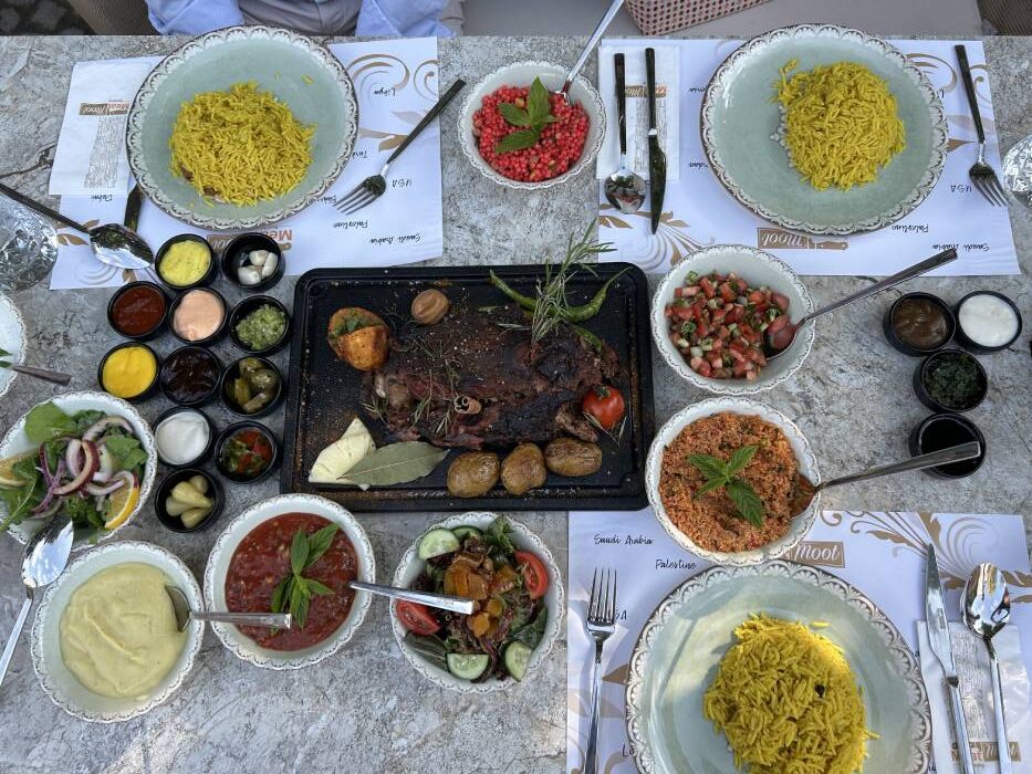 Tarçın, muskat ve defne yaprağı aromalı etimiz, özel safranlı pilav, salatalar ve soslarla servis ediliyor. Her şey o kadar iştah açıcı ki hangisinden başlayacağınızı şaşırıyorsunuz! MeatMoot restoranın kurucusu Balkanlar’dan gelen bu özel pişirme tekniğini Filistin mutfağıyla harmanlamış ve ortaya bizim de damak tadımıza çok uygun olan lezzetler çıkmış. Eti özellikle çeşitli soslarla tatlandırmak mümkün; örneğin şimdiye kadar ballı et ben hiç denememiştim, burada denedim ve çok sevdim.