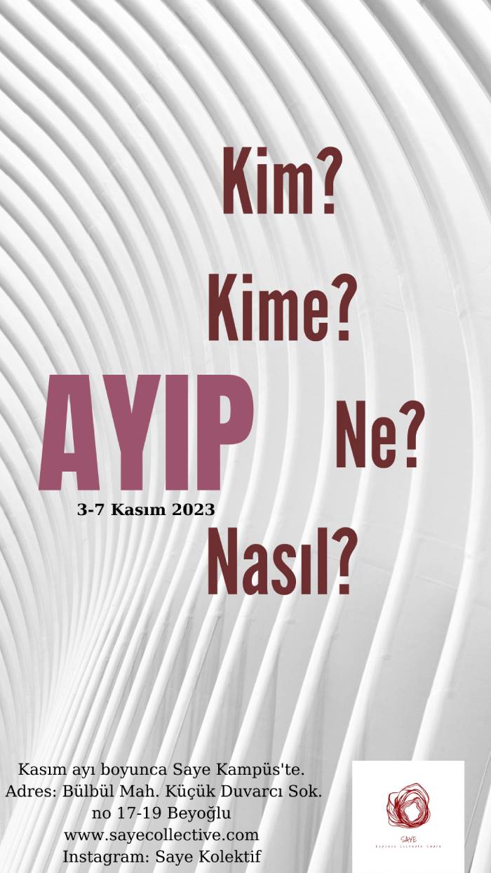‘’Ayıp’’ temasını Kasım ayı boyunca Saye’nin Taksim Kampüsü’nde seyirciyle buluşturacak olan Saye Kolektif, sene boyu gerçekleştirdiği atölyeler ve yazın açtığı misafir programları ile ‘’Ayıp’’ temasını etraflıca çalıştı, ortak üretime alan açarak Ayıpları hissetti, sanatı merkezine koyarak konu üzerinde bir farkındalık yarattı. 3-7 Kasım tarihlerinde ise performanslar, okumalar ve konuşmaların olduğu geniş programlamayla meraklı seyirciyi ayıp kavramı üzerine düşünmeye davet ediyor.