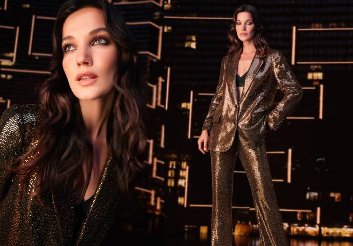 Şehrin ışıltısına kendi ışığını da katan Pınar Deniz, modern şehir hayatının vazgeçilmezi pantolon ceket takımlarına, yılbaşı ışıltısının gold detaylarını taşıyarak güçlü ve feminen bir duruş ile karşımıza çıkıyor.