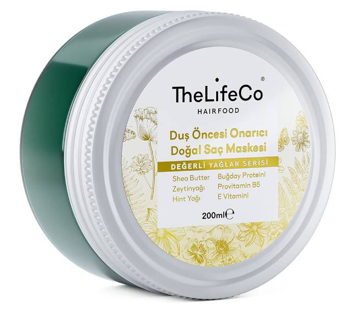 TheLifeCo HairFood Değerli Yağlar Serisi Duş Öncesi Onarıcı Doğal Saç Maskesi, yabancı maddeleri gidermek ve yorgun, stresli saçları onarmaya ve canlandırmaya yardımcı olmak için provitamin B5, E vitamini, zeytinyağı, shea butter, hint yağı, buğday proteini, provitamin B5 ve E Vitamini ile formüle edilmiştir.