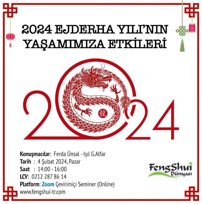 Ejderha yılı ele avuca sığmayan yüksek enerjili bir sene. Her an her şeyin değişebileceği, oldukça hareketli ve dinamik bir yıl. Uzakdoğu’da o kadar uğurlu kabul edilir ki, tüm kadınlar ejderha yıllarında bir bebek dünyaya getirmek için adeta yarışırlar. Neden acaba? İsterseniz, detaylı ipuçlarını seminere saklayalım. Fırsatlarla dolu yeni yılda öğrendiklerimizi sizinle paylaşmak dileğindeyiz. Arzu edenler web sitemizden girerek seminere kayıt yaptırabilirler hatta şans takviminden, aylık yorumlardan ve ipuçlarından faydalanmak için feng shui dünyası abonelik sistemine üye olup indirimli bilet alabilirler.