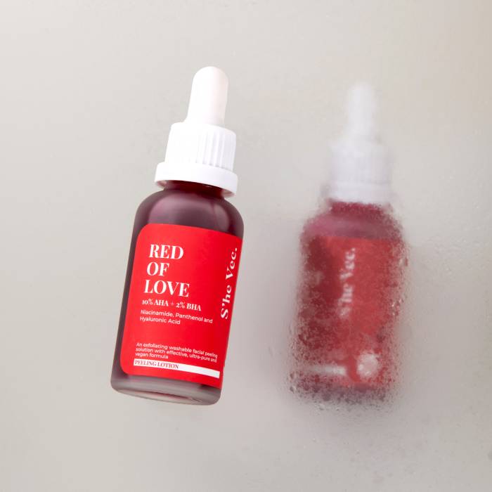 S’he Vec Red Of Love, içeriğindeki AHA – BHA ile cildin üst katmanına mikro peeling yaparak ölü derileri arındırır ve daha canlı bir cilt görünümü sağlar. Bitkisel ekstraktlar cilt bariyerini güçlendirir ve pürüzsüzleşmesini sağlar.