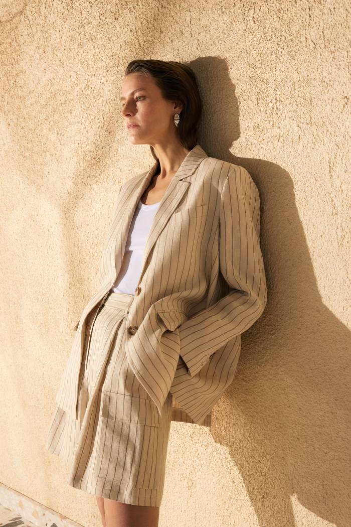 “City Summer” seçkisinde başrolde yer alan yavruağzı, sezonun diğer favori renkleri vizon, bej ve ekru ile buluşuyor. Şehir stiline zarif dokunuşlar katan parçalardan oluşan tema, Beymen Collection’ın çok sevilen etek-büstiyer takımlarını geri getiriyor. Temanın başrolündeki “Endonezya Çiçek” deseniyle hareket kazanan takımlar koleksiyona dinamizm katıyor. Keten kumaştan hayat bulan çizgili ceket-yelek kombinasyonları ve tüvit trikolar, temanın tamamlayıcı parçaları arasında yer alıyor.