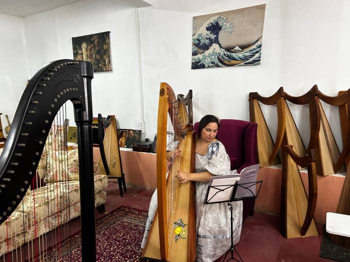 Çeşitli boylarda arpların sıralandığı bir atölyede karşılıyor bizi Zeynep Öykü. Beline kadar uzun saçları ve özel dikim Barok stildeki elbisesiyle bir masal prensesi edasında. Tanışmamızın ardından arpları inceleme fırsatını buluyorum. Büyülü enstrümanın birkaç boyu olduğunu ve üzerlerine kişiye özel resim yapıldığını öğreniyorum sohbetimiz sırasında. Röportajımıza geçmeden önce Öykü’nün önceki gece bizim için kendi elleriyle hazırladığı tatlıların bulunduğu masaya yöneliyorum. Sol anahtarı süslü kremalı kurabiyelerim (detaylara bayıldım) ve kahvemle bu özel yolculuğun hikayesini dinlemeye başlıyorum.