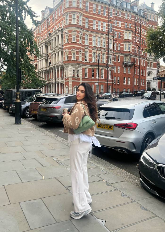 Tasarımlarda kahverengi kadifenin retro zarafeti dikkat çekiyordu. Kadife takım elbisenin parlak ve yumuşak yüzeyi, retro bir hava yaratırken, minimal detaylarla tamamlanmış aksesuarlar – büyük çanta ve güneş gözlükleri – görünümü sade ama etkileyici bir hale getiriyordu. Bu kombin, modern iş hayatında hem güçlü hem de zarif bir duruş sergilemek isteyen bireylerin tercih edebileceği bir tarzı simgeliyordu. Kadifenin zarif dokusu ve tasarımın rafine duruşu, izleyenlere nostaljik ama modern bir şıklık sundu.