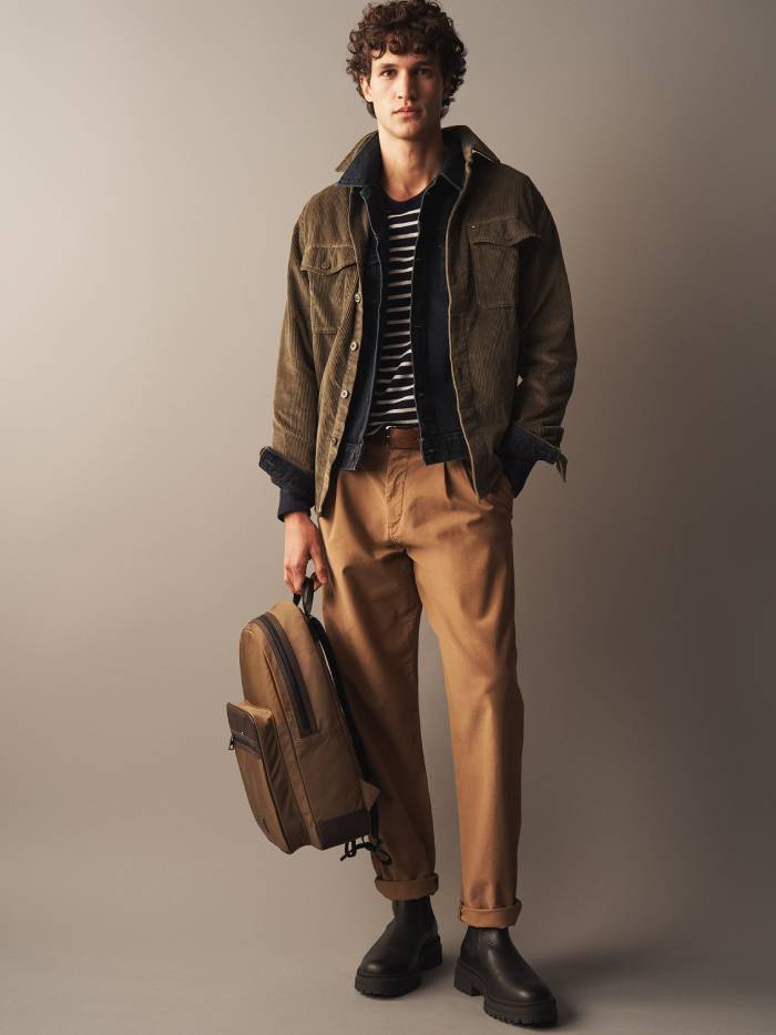 Bu görünüm tamamıyla dokularla ilgili. Kolayca giyilip çıkarılabilen çeşitli katmanlardan oluşan görünüm, yumuşak bir fermuarlı pelüş sweatshirt, kalın bir gömlek ve bir fitilli kadife chino pantolon içeriyor. Birlikte ya da tek olarak harika görünen her parça anında sonbahar gardırobunun temelleri arasındaki yerini alıyor.