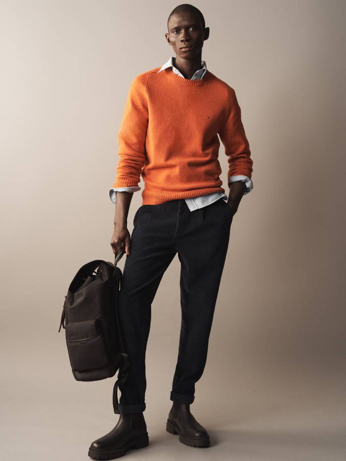 Turuncunun sıcaklığını hissettiren yumuşak bir lambswool kazak, klasik bir Oxford gömleğin üzerinde zahmetsiz bir kat oluyor. Pilili fitilli kadife chino pantolon dokulu bir hisle görünümü şıklaştırıyor. Deri detaylı bir sırt çantası görünümü tamamlıyor.