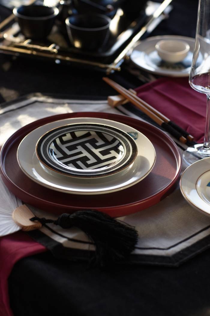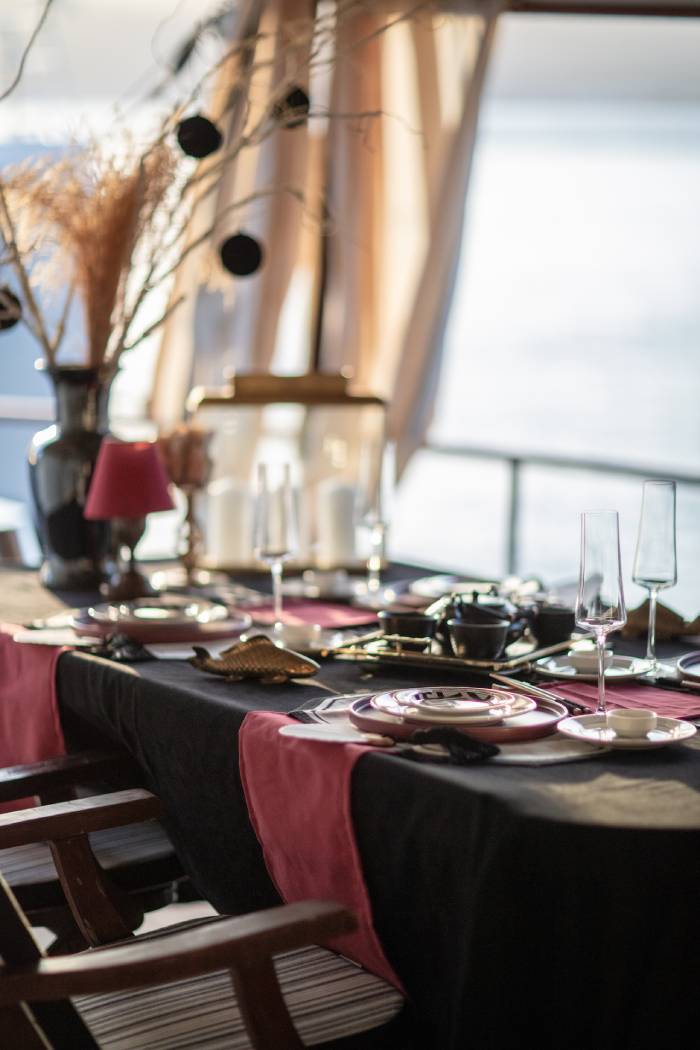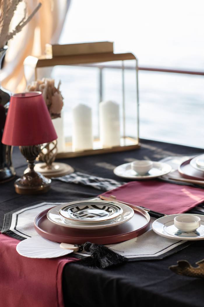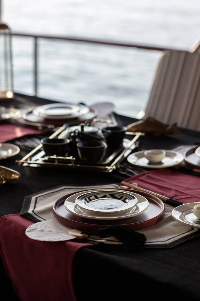 Shangri La, adını James Hilton’un aynı isimli romanından alan, hayali bir cenneti temsil eden bir yer… Bu yeni yıl yemeğinde tam da o cennetin bir yansımasını sunmayı amaçlayan tasarımcı Uzak Doğu’nun derin kültürel mirasını, Hollywood’un zarafetiyle harmanlıyor. Güvertede kurulan sofra, denizin ortasında bir vaha misali, ince detaylarla bezeli. Dramatik koyu masa örtüleri, Uzak doğunun olmazsa olmazı derin bordo ve kırmızılar, narin bambu yemek takımları, pirinç mumluklar ve Uzak Doğu motifleriyle süslenmiş aksesuarlar, Yepyeni bir yılı karşılarken en çok ihtiyaç duyulan şey umut ve önümüzde uzanan yeni yılda neler olacağına dair bir merak. Şans getirdiğine inanılan Pirinç Japon Koi balığı figürleri, Gold yansımalı tabaklarda servis edilen Fortune Cookie’ler ve bir zamanlar lüksün ve aristokrasinin simgesi olan Uzak doğu kültürünün önemli unsurlarından katlanır yelpazeler, her bir konuk için tabağının hemen yanı başında sofrayı süsleyen en karakteristik detaylardan olarak yerini aldı.