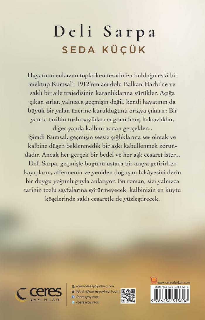 Hayatının enkazını toplarken tesadüfen bulduğu eski bir mektup Kumsal’ı 1912’nin acı dolu Balkan Harbi’ne ve saklı bir aile trajedisinin karanlıklarına sürükler. Açığa çıkan sırlar, yalnızca geçmişin değil, kendi hayatının da büyük bir yalan üzerine kurulduğunu ortaya çıkarır: Bir yanda tarihin tozlu sayfalarına gömülmüş haksızlıklar, diğer yanda kalbini acıtan gerçekler… Şimdi Kumsal, geçmişin sessiz çığlıklarına ses olmak ve kalbine düşen beklenmedik bir aşkı kabullenmek zorundadır. Ancak her gerçek bir bedel ve her aşk cesaret ister… Deli Sarpa, geçmişle bugünü ustaca bir araya getirirken kayıpların, affetmenin ve yeniden doğuşun hikâyesini derin bir duygu yoğunluğuyla anlatıyor. Bu roman, sizi yalnızca tarihin tozlu sayfalarına götürmeyecek, kalbinizin en kuytu köşelerinde saklı cesaretle de yüzleştirecek.