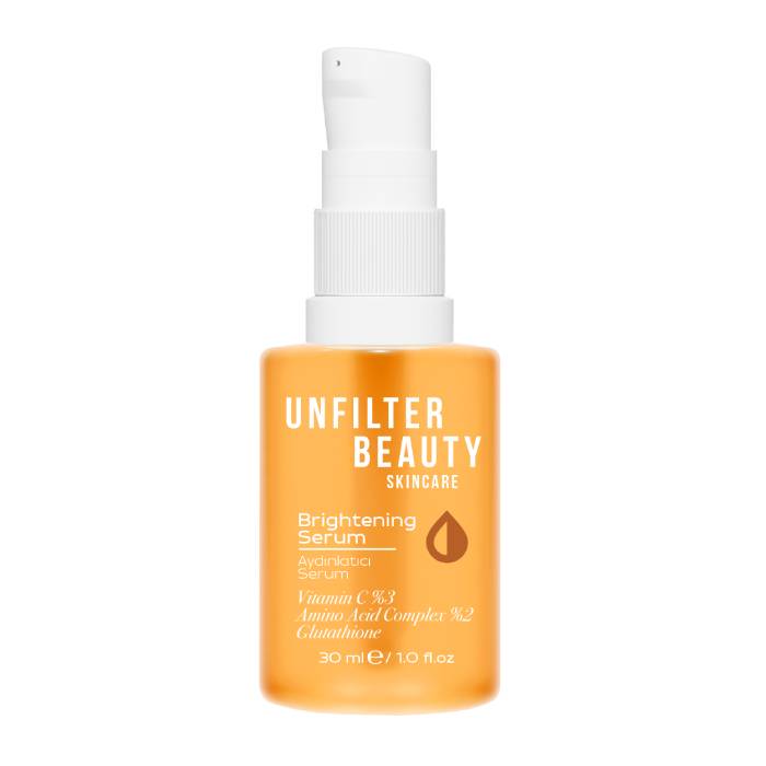 Cildine ışıltı katmanın tam zamanı! C vitamini, amino acid complex ve glutathione içeren Unfilter Beauty Aydınlatıcı Serum, güçlü formülüyle cildin doğal ışıltısını ortaya çıkarırken nem bariyerini koruyarak elastikiyetini artırmaya yardımcı oluyor. İnce çizgi görünümünü minimize eden peptidler ise cildin her zamankinden daha canlı, aydınlık ve eşit tonda görünmesini destekliyor.