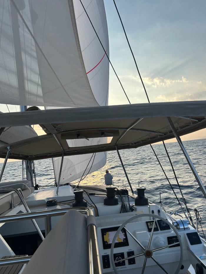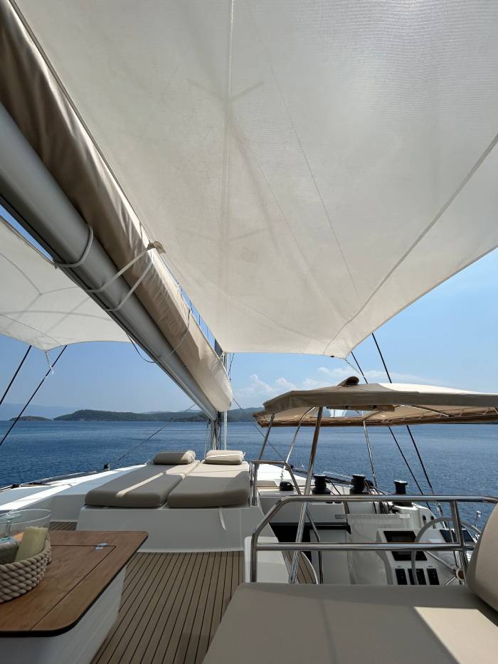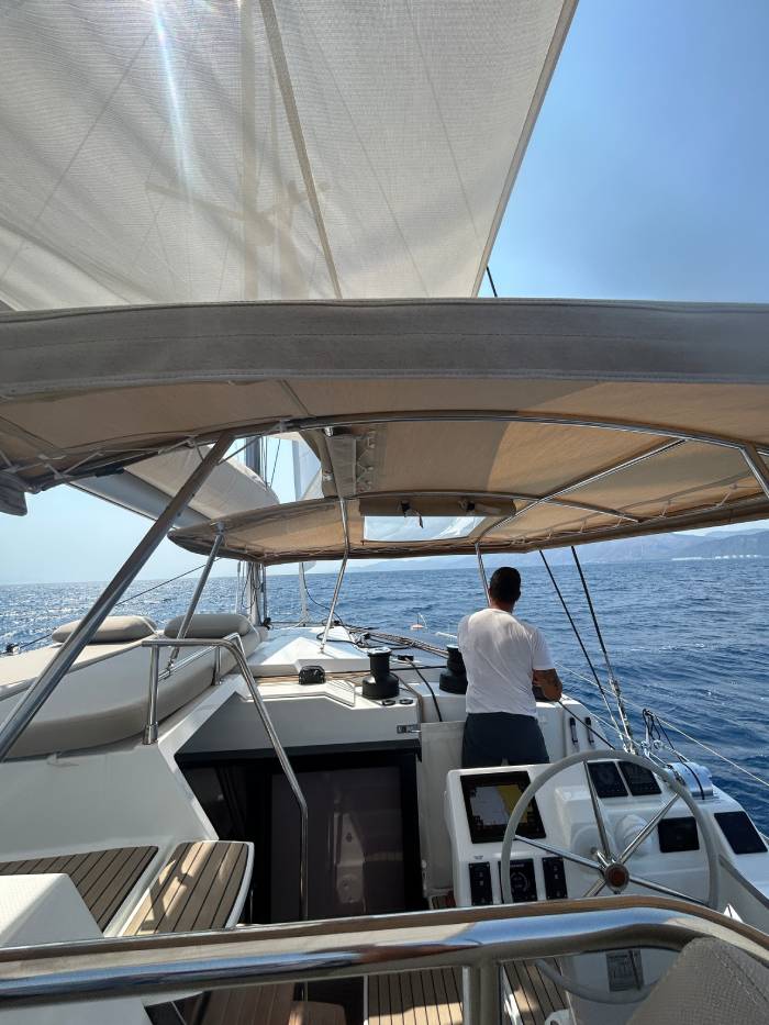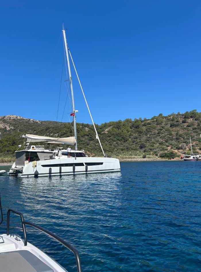 Bizim teknemiz Fountaine Pajot 51, bir katamaran. Katamaranların en büyük farkı, geniş yaşam alanlarıyla sunduğu konfor. İki gövdeye sahip oldukları için hem güvertede hem de iç mekânda çok daha ferah bir alan sağlıyorlar. Bu da uzun yolculuklarda hareket özgürlüğü ve rahatlık demek. Fountaine Pajot 51’in en sevdiğimiz özelliklerinden biri, geniş salon ve güverte düzeni. Misafirlerimizle keyifli sofralar kurabiliyor, aynı anda hem mahremiyet hem de sosyallik yaşayabiliyoruz. Ayrıca büyük pencereler sayesinde gün boyu doğal ışık içeri doluyor, denizle iç içe bir yaşam alanı yaratıyor. Kabinlerde ise otel konforuna yakın bir rahatlık var; uzun seyirlerde bu gerçekten büyük bir fark yaratıyor. Kısacası, katamaranımız sadece bir ulaşım aracı değil; denizin üzerinde ev konforu sunan bir yaşam alanı.