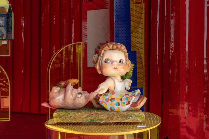 Eda Taşlı: “Kendi heykellerimde olduğu gibi bu sergi için de ‘inşa etme’ fikri sadece bir şey ortaya koymak değil, aynı zamanda hayal gücüyle yeni bir dünya kurmak anlamına geliyor. Bu eserimde yürüyen bir figür, kocaman bir hayvanı kulağından tutarak birlikte ilerliyor. O hayvan benim yaratıcılık tarafım; eğlenceli, hayali arkadaşlarım gibi. Çiçeklerle birlikte yürüyen bu ikili, aslında yaratma sürecini, yeni bir dünyayı birlikte inşa etmeyi simgeliyor. Kızlara da küçük parçaların birleşerek güçlü bir bütüne dönüşebileceğini göstermek istedim. Sanatımda da hayat gibi; denge, cesaret ve oyun duygusu bir araya geldiğinde ortaya kimsenin tahmin edemediği güzellikler çıkıyor.”