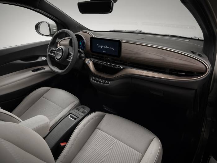 FIAT 500e Giorgio Armani Collector’s Edition’ın iç mekânı, geleneksel el sanatları tekniklerini anımsatan şerit dikişler ve orta koltuk eklerindeki üç boyutlu desenlerle yansıtılan olağanüstü işçiliğe dikkat çekiyor. Kabinde kullanılan malzemeler, ileri teknoloji ve geleneksel yöntemleri bir araya getirerek zarafeti ve en yüksek kalite seviyesini yansıtıyor. Yenilikçi detaylar arasında gösterge panelinde lüks kumaşa benzer bir yumuşaklık sunan lazer kesim ahşap bir ek yer alıyor. Bunlara, ince işçiliğe olan bağlılığı vurgulayan ayrıntılı el işçiliği unsurları, örneğin gösterişli nakışlar da eşlik ediyor. Aracın jantlarında ve koltuklarında Milanolu üstadın logosu yer alırken, imzası gösterge panelinde, iç kapılarda ve arka camda belirgin bir şekilde yer alıyor. Elbette bu da iş birliğinin özgün karakterini ve ayrıntılara gösterilen özeni vurguluyor.