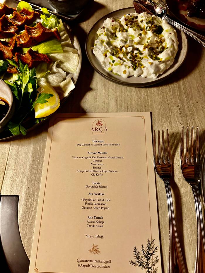Biz de gastronomi yazarları olarak Haliç manzarası eşliğinde en sevilen lezzetleri sunan Arça’ya davetliydik. Executive Chef Cenap Varol ve ekibinin hazırladığı mönüde serpme mezeler, ara sıcaklar ve ana yemek olarak da Adana kebap ile tavuk kanat sunuldu. Hepsi çok lezzetliydi; vişne ile organik dut pekmezli yaprak sarma, muammara ve çiğ köfte mezeler arasında öne çıkanlardı. Gavurdağı salatası ise her adımda özel bir eşlikçiydi. Ana yemeğin ardından da meyve tabağı ikram edildi.