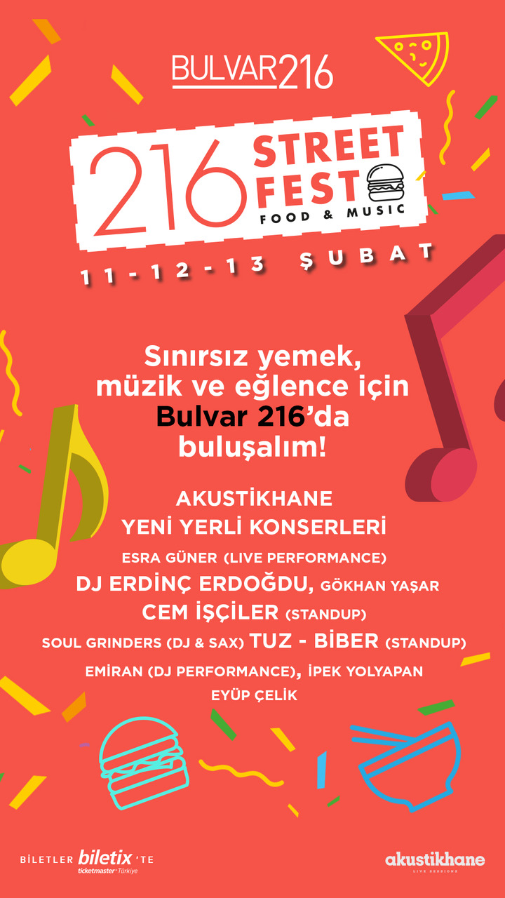 Birbirinden leziz yemeklerle birlikte Akustikhane Yeni Yerli Sanatçıları ile birçok sürpriz ismin her gün ayrı bir müzikal konsepte bürüneceği 216 Street Fest; katılımcılara hem leziz hem de keyifli anlar yaşatacak. Tuz Biber Show da festivalde son gösterisini tüm katılımcılara sunacaklar.