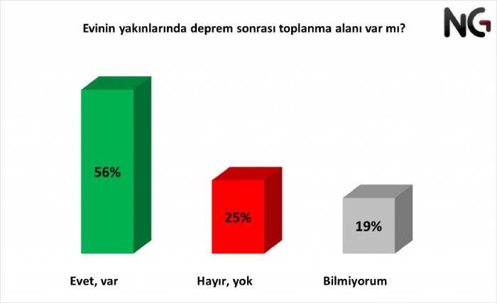 Katılımcıların çoğunluğu evinin yakınında deprem toplanma alanı olduğunu belirtti. Her 4 kişiden 1’inin ise deprem toplanma alanı olmadığını belirtmesi dikkat çekici bir sonuç olarak ön plana çıkıyor.